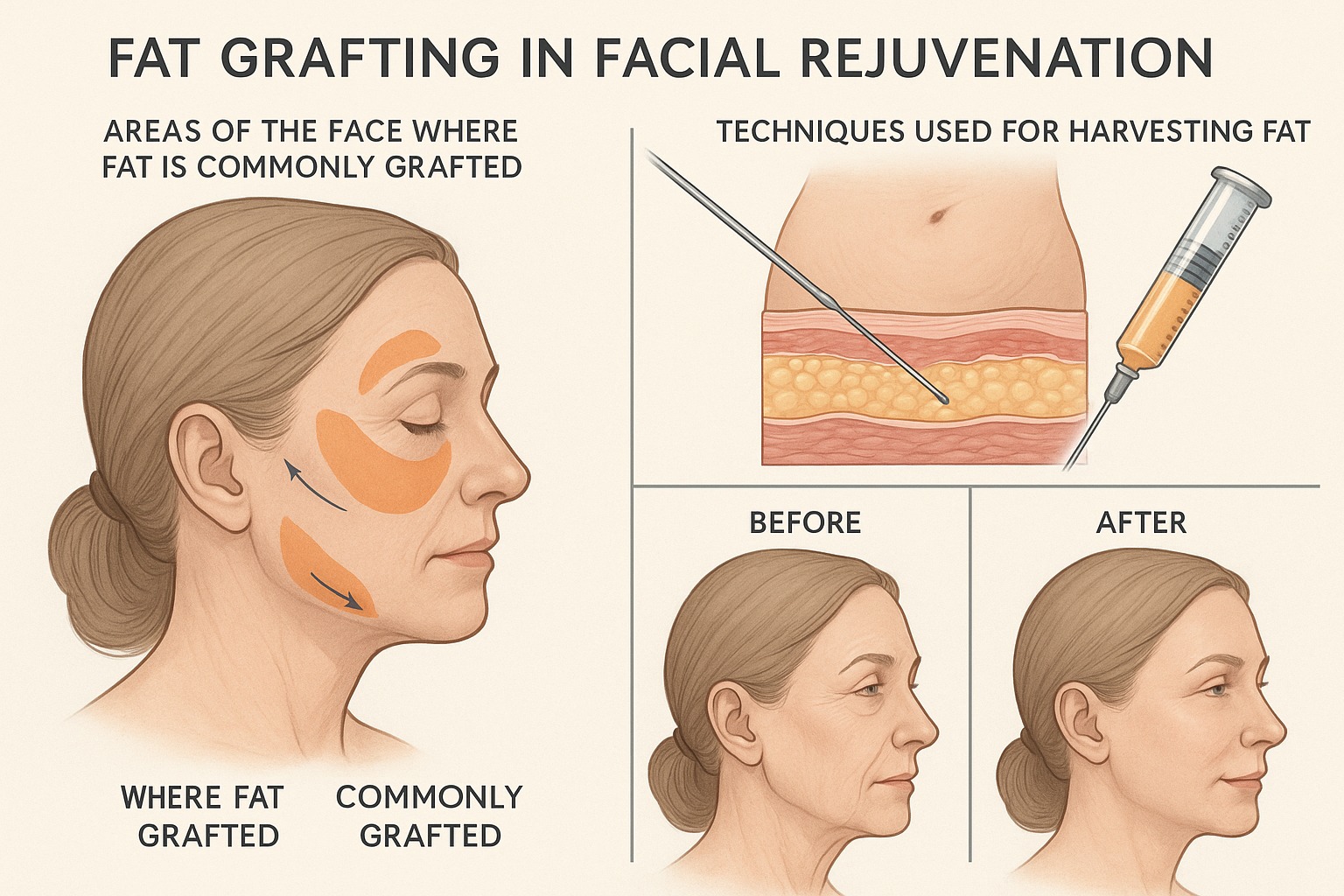 Fat grafting is a minimally invasive procedure that involves harvesting fat cells from one part of the body—usually the abdomen, flanks, or thighs—processing and purifying them, and then injecting these live fat cells into areas of the face where volume is lost. Because it uses the patient’s own tissue, fat grafting avoids risks linked with synthetic fillers, such as allergic reactions or rejection.
