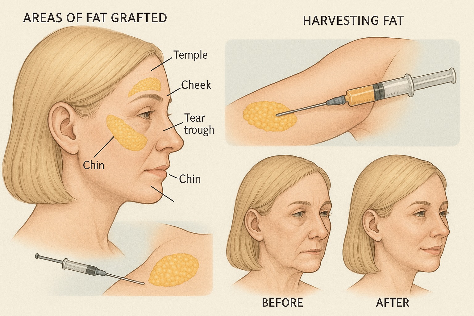 Harvested fat comes from areas where it may be surplus, like the abdomen or thighs, providing subtle body contouring along with facial volumization. - Versatile Restoration